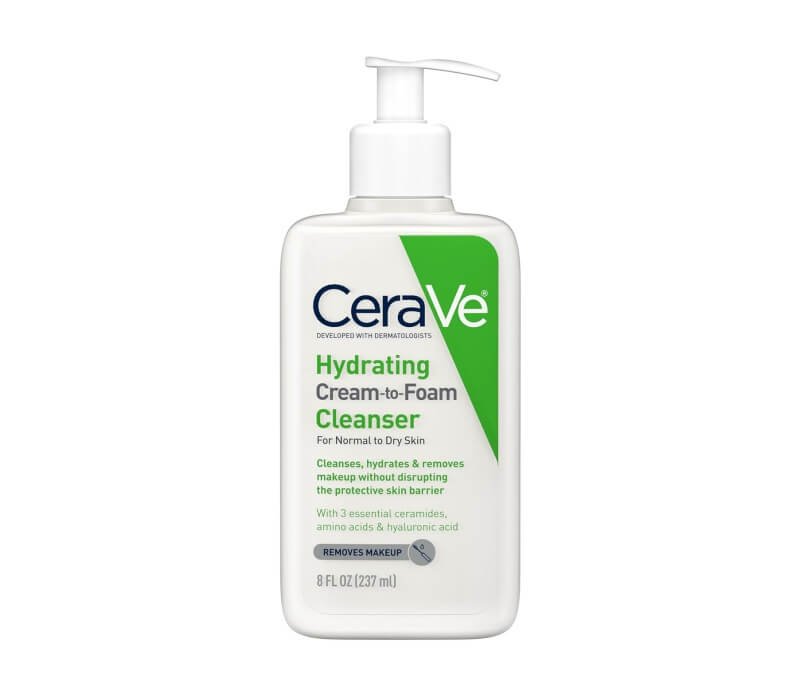 Desarrollado con dermatólogos, CeraVe Hydrating Cream-to-Foam Facial Cleanser tiene una fórmula limpiadora única en un solo paso con tres ceramidas esenciales (1, 3, 6-II) que limpia suavemente, elimina la grasa y el maquillaje en profundidad e hidrata la barrera cutánea.