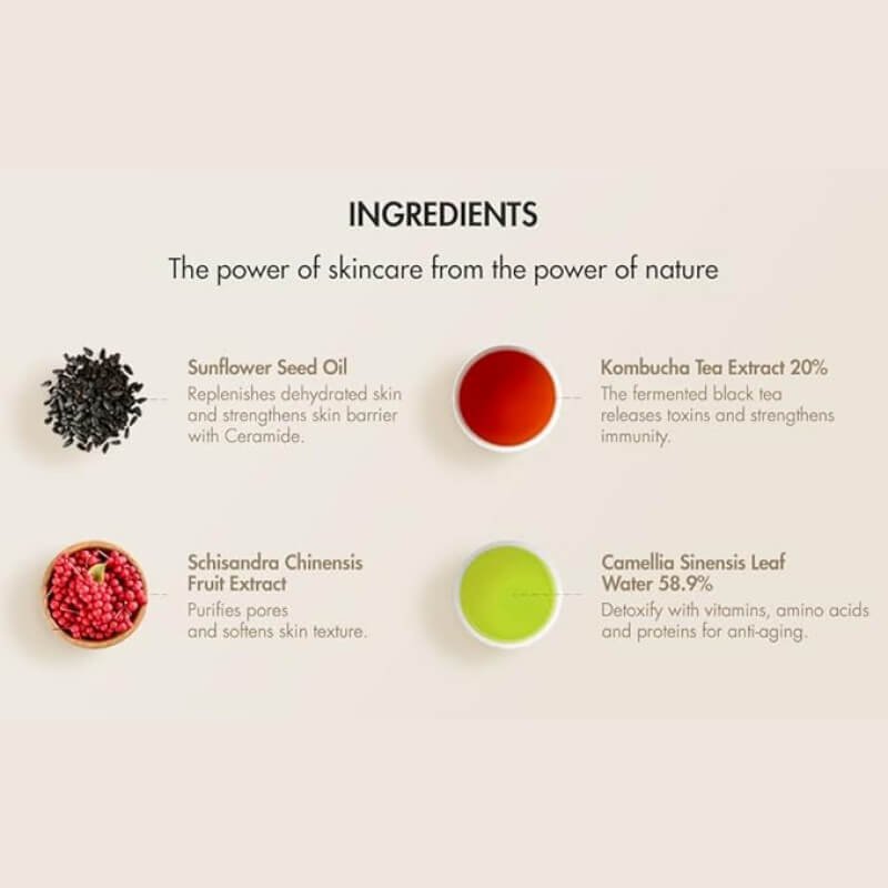 • Cuidado nutritivo: infundido con extracto de té de kombucha, agua de hoja de camelia y aceites de girasol, brinda hidratación intensa mientras calma y nutre la piel, ayudando a restablecer el equilibrio y mejorar la apariencia general de la piel.